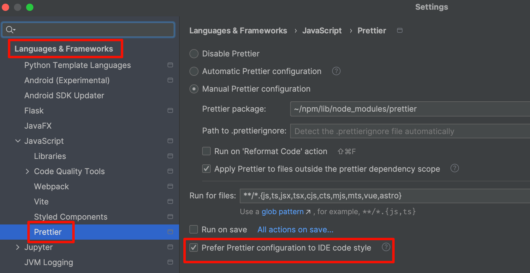 最后在Languages & Frameworks -> Javascript -> Prettier -> Prefer Prettier configuration to IDE code style 取消这个钩子就可以了(或者直接Disable Prettier)。